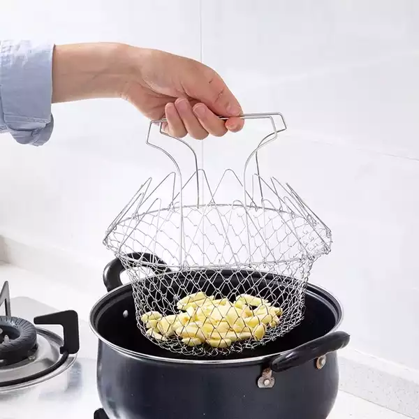Rổ với thiết kế thông minh gồm các móc xích dễ dàng được gập gọn, nhanh chóng biến hóa thành nhiều công cụ giúp bạn luộc, chiên thức ăn đơn giản và nhanh chóng